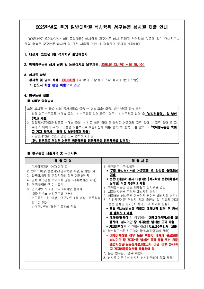 [공지] 2025학년도 후기(2026년 8월 졸업예정자) 석사학위 청구논문 심사원 제출 안내