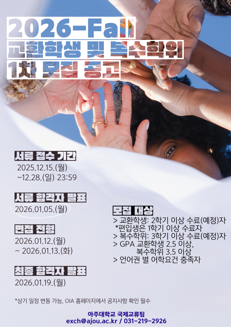 [학사] [국제교류팀] 2026-2학기 파견 교환 및 복수학위 1차모집 공고(~12/28)