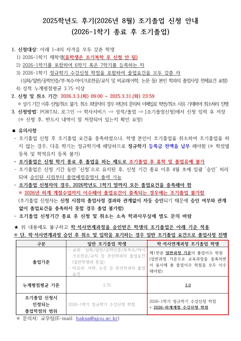 [공지] [학부/학사과정]2025학년도 후기(2026년 8월) 조기졸업 신청 안내