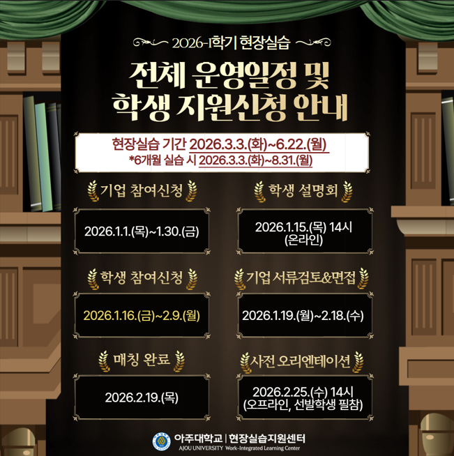 아래와 같이 26-1학기 현장실습 학생 지원신청에 대해 안내드리오니, 관심있는 학생들의 많은 지원/참여 바랍니다.