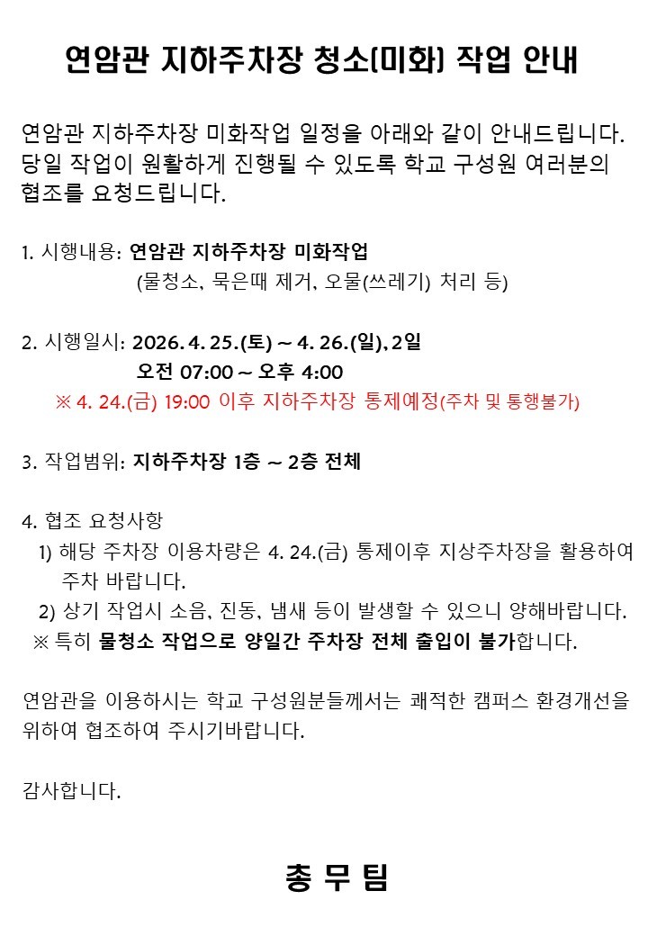 [공지] 연암관 지하주차장 청소(미화) 작업 시행 안내